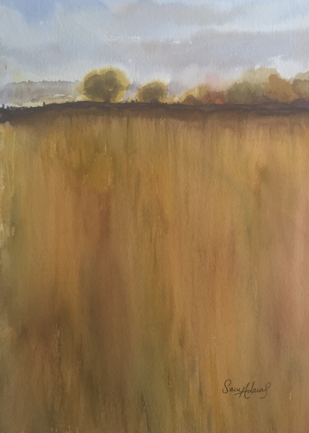 Inspired by the elegant rustic hidden landscape of the Hindon valley in Wiltshire just over the border of North Dorset and not far from Wardour Castle.I created an outdoor feel of the long narrow hill and beyond Semley hill.I used a wet in wet technique- three colours and a large bamboo flat brush made of wool to create the washes and a distinctive tree line using my horizontal line technique.All my paintings are from reality and impressions in original watercolour.This is not far from where I live just over the hill and Valley -Shaftesbury -North Dorset.